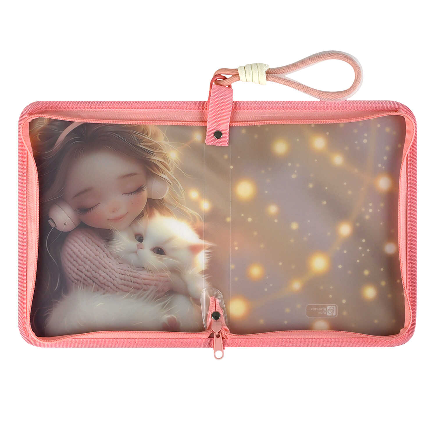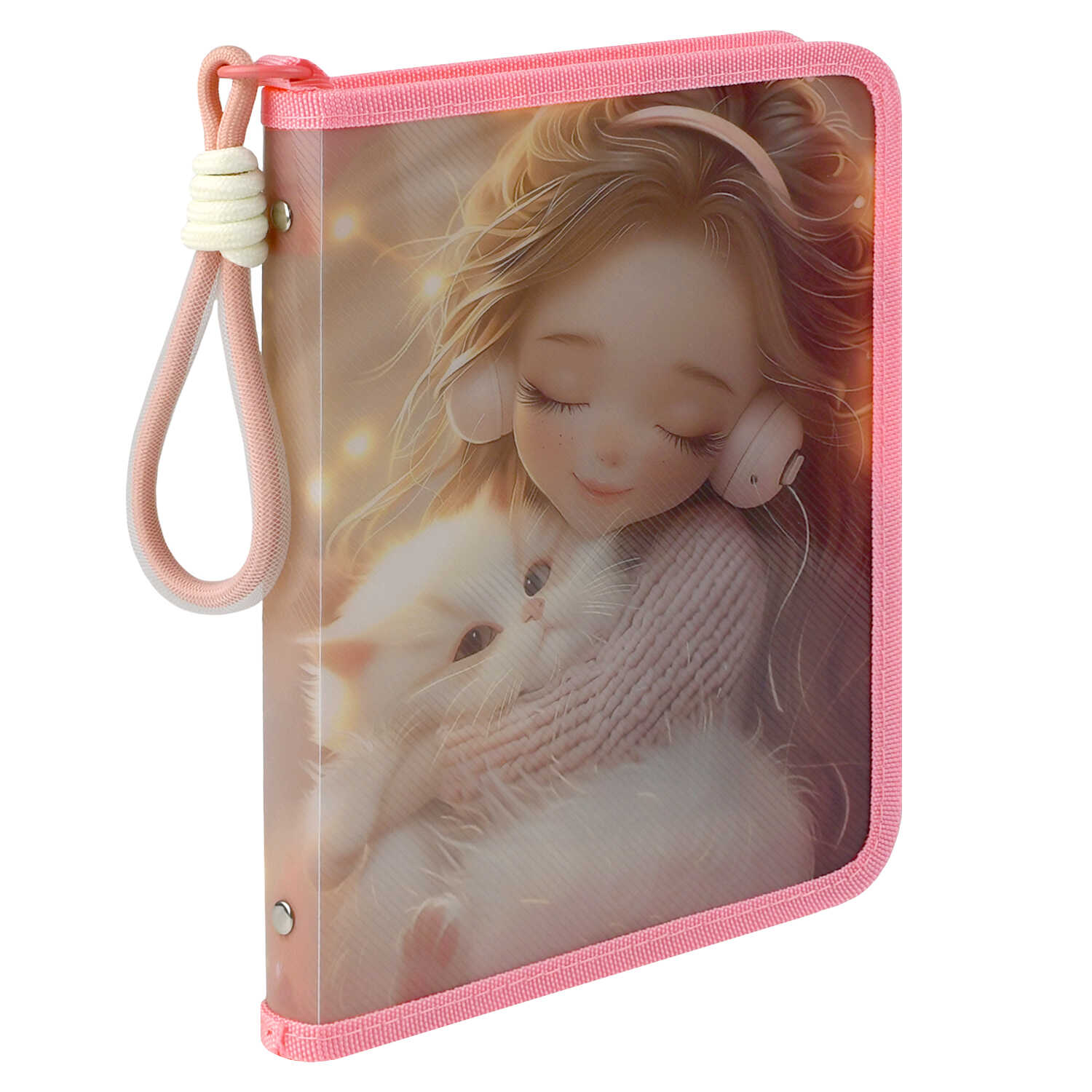 Папка для школьных тетрадей пластиковая Феникс+, арт. 72367/ 12 ДЕВОЧКА В НАУШНИКАХ И КОТЕНОК (полипропилен, формат А5, 23х17,5х2,5 см, 1 отделение (-я), молния, УФ-печать)