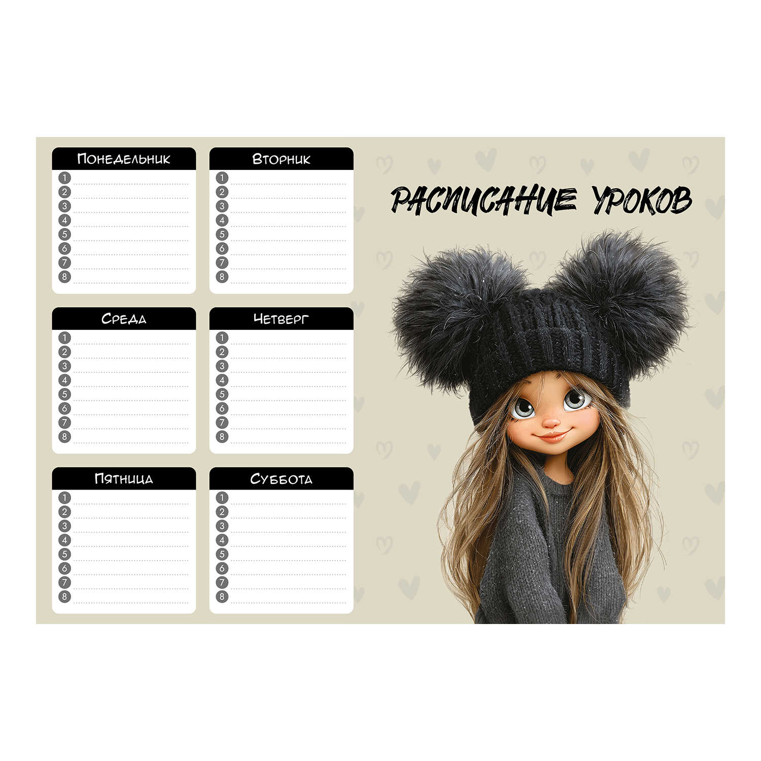Расписание уроков А4, арт. 72588/ 50 ДЕВЧОНКА В ШАПКЕ (210×297 мм, материал: мелованный картон 235 г/м², полноцветная печать, декор: выборочный УФ-лак; индивидуальная упаковка: нет)
