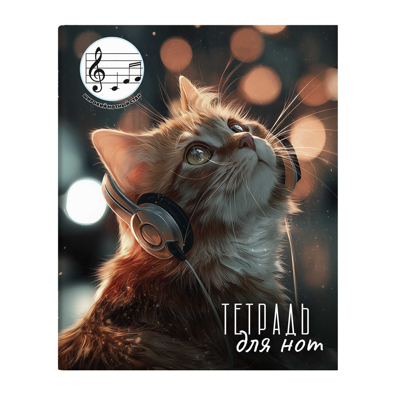 Тетрадь для нот для младших классов 24 л. арт. 73212 КОТЁНОК В НАУШНИКАХ /А5+, белый офсет, мягкий переплёт (2 скобы), облож.- мелованный картон 190 г/м², глянцевая ламинация, глянцевая ламинация. расширенный нотный стан. нет/