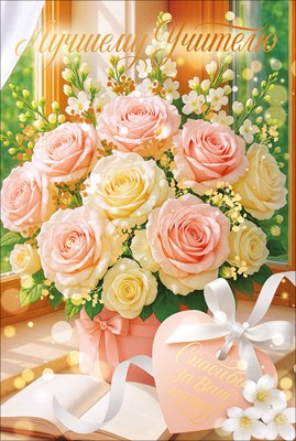 Открытка А5 «Лучшему учителю! Спасибо за ваш труд!» (букет в шляпной коробке, книга, окно) текст 2045
