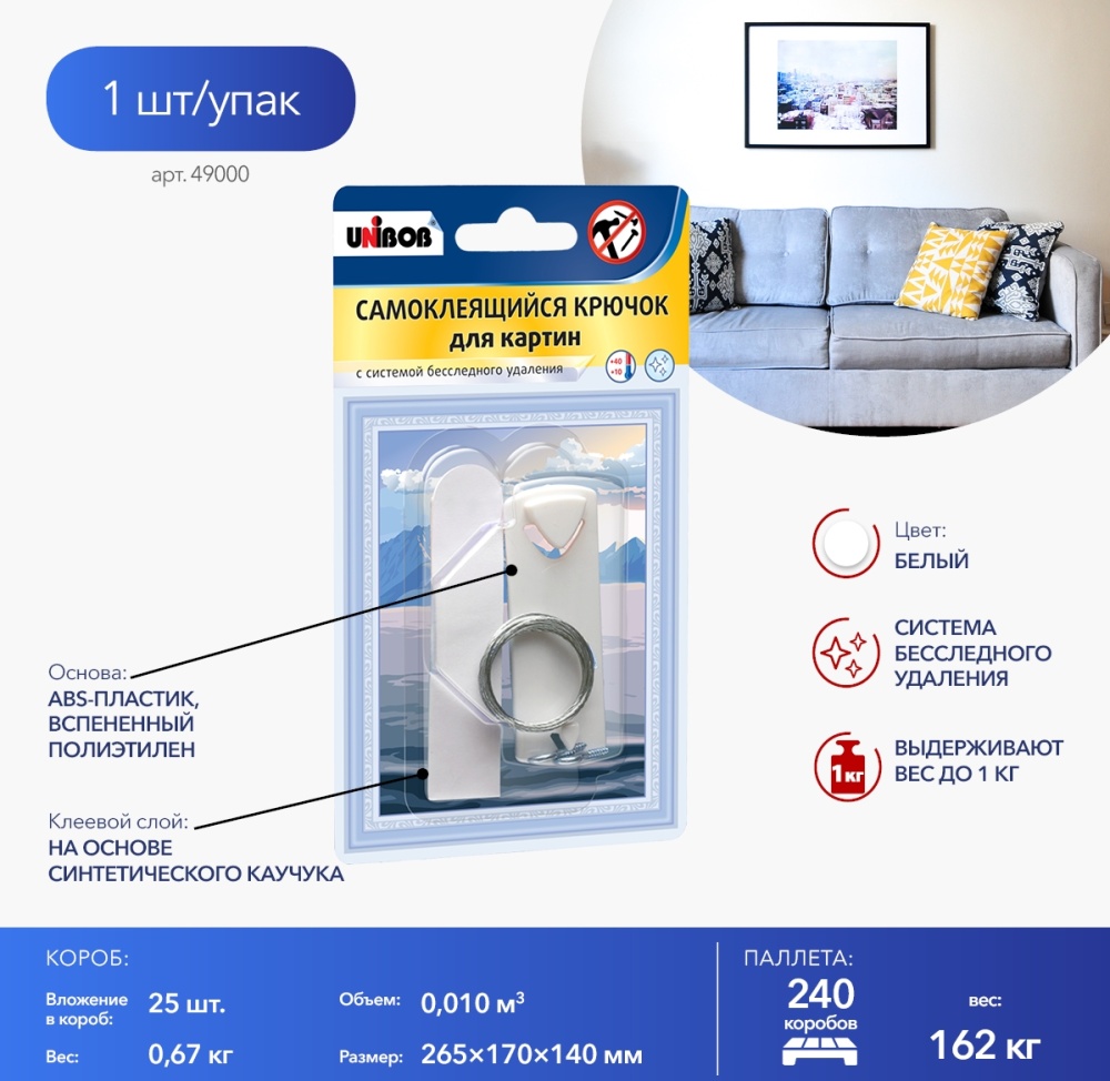 Крючок для картин самоклеящийся UNIBOB, белый арт 49000 7850