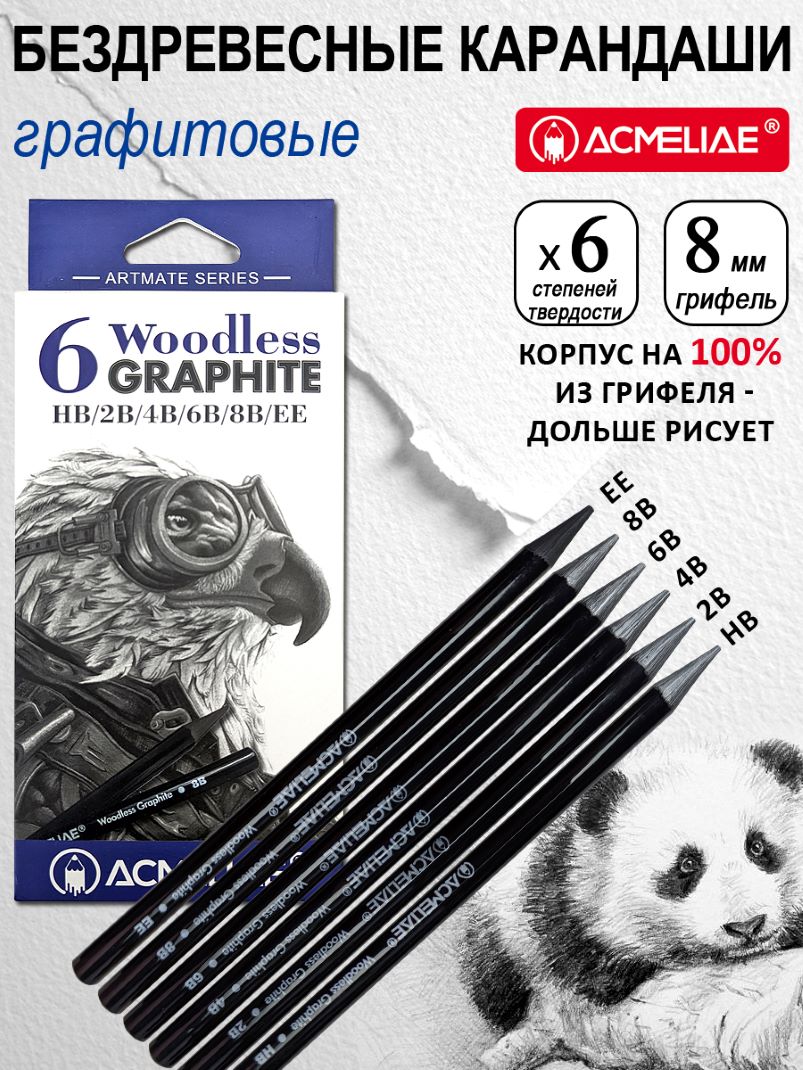 Карандаш ч/г бездревесный графитовый Набор 6 твердостей (HB, 2B, 4B, 6B, 8B, EE) ACMELIAE блистер 8659