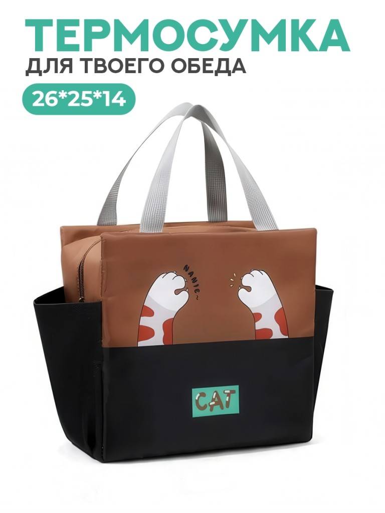 Термосумка с оригинальным принтом — практичный и вместительный аксессуар для хранения и переноски продуктов. Внутренний термоизоляционный слой помогает сохранять температуру еды и напитков в течение длительного времени. Удобные прочные ручки обеспечивают комфорт при переноске, а боковые карманы добавляют функциональности. Размер 26х25х14 см позволяет разместить всё необходимое для работы, учёбы или пикника.