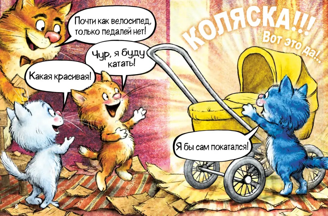 (3+) Однажды после прогулки Федя, Вася и Тося обнаружили дома большую коробку. Но что в ней? Таинственная посылка не даёт котятам покоя. К тому же они так давно мечтают о новеньких велосипедах! А вдруг? Но… в этот раз их ждёт совсем другой сюрприз. В коробке детская коляска для младшего братика!